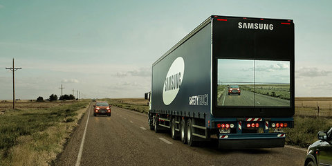 Samsung’s Argentinian arm has come up with a novel solution to the overtaking problem by fitting a wireless camera to the front of a semi-trailer and a set of outdoor TV screens to the rear.